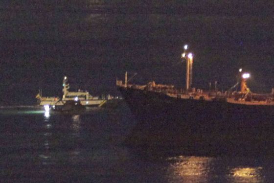 Imagen del incidente de esta noche el Gibraltar. Se puede ver la patrullera oceánica de la Guardia Civil junto a un mercante. / A.Carrasco Ragel (EFE)