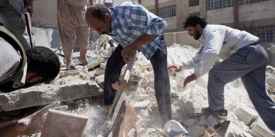 Habitantes de Alepo buscan entre los escombros de un edificio destruído durante un bombardeo. / ACHILLEAS ZAVALLIS (AFP)