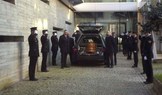 El féretro con los restos de la agente fallecida, a su llegada ayer a la comisaría de Vigo, donde se instaló la capilla ardiente. / Salvador Sas (EFE)